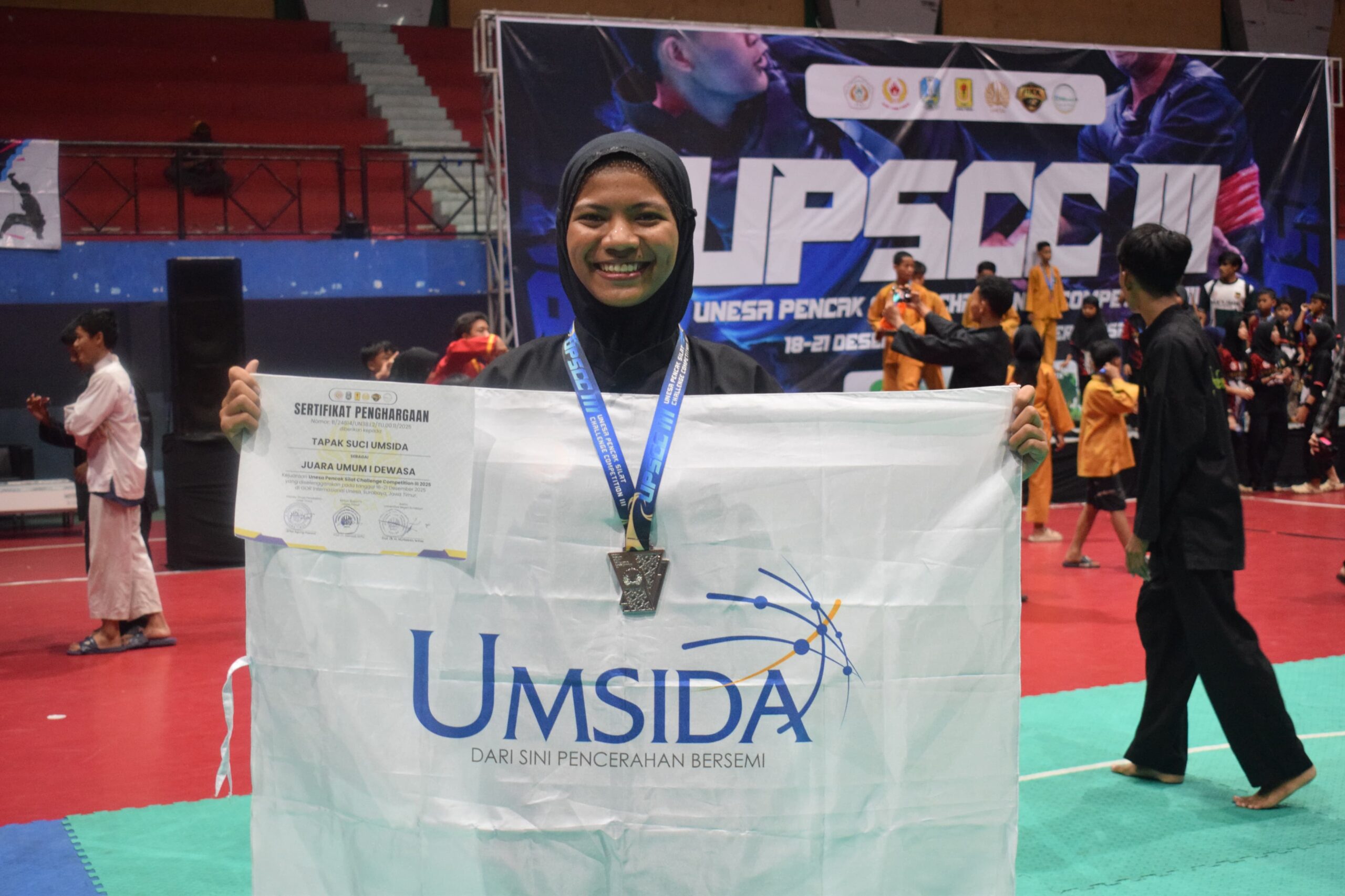 Fai.umsida.ac.id – Mahasiswi Fakultas Agama Islam (FAI) Umsida dari Program Studi Pendidikan Agama Islam (PAI) semester 5, Putri Hikmiyatil Latifah yang akrab disapa Hikmah, berhasil meraih medali emas pada ajang UNESA Pencak Silat Challenge Competition III (UPSCC III) tingkat nasional yang digelar pada 18–21 Desember 2025 di GOR Internasional Unesa, Lidah Wetan, Surabaya. Baca Juga:...Read More