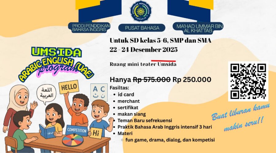 Fai.umsida.ac.id- Ma’had Umar Bin Khattab (MUBK) Fakultas Agama Islam (FAI) Universitas Muhammadiyah Sidoarjo (Umsida) bekerja sama dengan Pusat Bahasa Umsida mengadakan program liburan seru untuk siswa SD, SMP, dan SMA bertajuk Umsida Arabic English (UAE) Program. Baca Juga: Tingkatkan Pemahaman Ekonomi Moneter Islam, Prodi Ekonomi Syariah Umla Kunjungi Pesya Umsida Program ini akan diadakan pada 22-24 Desember 2025 di Ruang Mini Teater Umsida, dan dirancang untuk memberikan pengalaman belajar yang...Read More