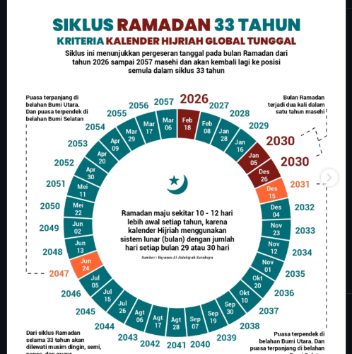 Fai.umsida.ac.id-Ramadhan, bulan yang penuh berkah, memiliki kedinamikan yang luar biasa dalam peredarannya di kalender Hijriah. Baca Juga: Kitab Falak Abad ke-19 Presisi Tentukan 1 Ramadan 1447 H pada 18 Februari 2026 Menurut sistem lunar yang digunakan dalam kalender Hijriah, setiap tahun awal Ramadan akan bergeser sekitar 10 hingga 12 hari lebih awal dibandingkan kalender Masehi. Hal ini disebabkan oleh perbedaan sistem perhitungan waktu yang mendasarkan tahun Hijriah pada peredaran bulan,...Read More