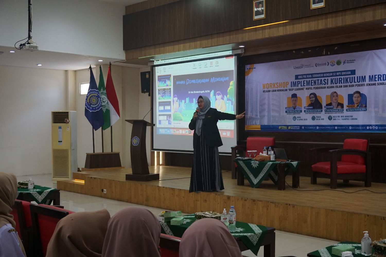 Dalam kegiatan ini, Dekan FAI Umsida Dr Ida Rindaningsih, M.Pd, hadir sebagai narasumber dan menekankan pentingnya pembelajaran mendalam atau deep learning dalam mata pelajaran Pendidikan Agama Islam dan Budi Pekerti jenjang sekolah dasar. Fokus itu juga tercantum dalam bahan presentasi workshop yang mengangkat tema inovasi pembelajaran mendalam.